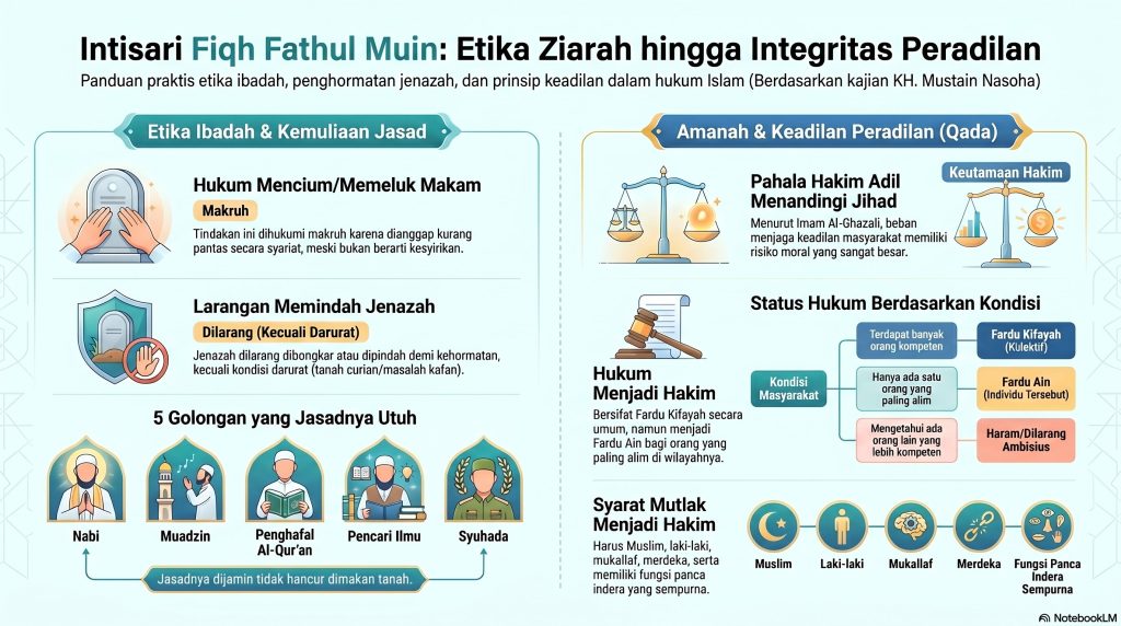 Kajian rutin Fiqh Fathul Muin ini diselenggarakan pada Minggu, 19 April 2026, bertempat di Masjid Raya Sheikh Zayed Solo dengan menghadirkan KH. Mustain Nasoha. Dalam pemaparannya, beliau membedah berbagai persoalan praktis mulai dari etika ziarah kubur, kemuliaan seorang muadzin, hingga tanggung jawab besar seorang hakim dalam sistem peradilan Islam.
