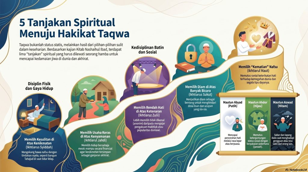 Ustadz Muzakki menekankan bahwa taqwa bukanlah status yang statis, melainkan hasil dari pilihan-pilihan sulit yang diambil seseorang dalam kesehariannya. Mengutip pendapat para Hukama atau ahli hikmah, beliau menjelaskan bahwa di depan pintu taqwa terdapat lima tanjakan yang harus dilewati. Siapa pun yang berhasil melampaui kelima tantangan ini, maka ia akan memperoleh hakikat ketaqwaan yang akan menyejukkan jiwanya baik di dunia maupun di akhirat.