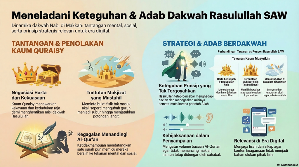 Sebuah fragmen sejarah yang sangat menarik dibahas adalah ketika para pemimpin Quraisy berkumpul di dekat Ka’bah untuk menyusun strategi membungkam Nabi. Mereka mencoba melakukan “negosiasi” duniawi dengan menawarkan harta yang melimpah, kedudukan sebagai raja, hingga pengobatan terbaik jika Nabi dianggap sedang sakit. Penawaran ini menunjukkan betapa rendahnya cara pandang kaum musyrikin terhadap misi suci yang dibawa oleh Rasulullah SAW.