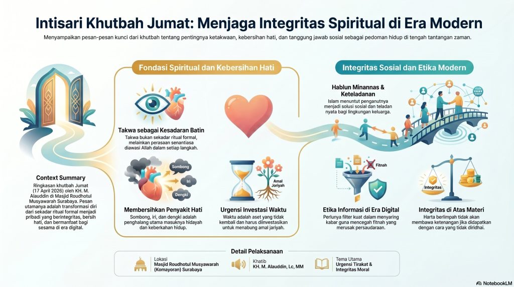 Khutbah ini berlangsung pada hari Jumat, 17 April 2026, bertempat di Masjid Roudhotul Musyawarah (Kemayoran) Surabaya, sebuah rumah ibadah bersejarah yang menjadi saksi bisu perkembangan syiar Islam di Kota Pahlawan Khutbah tersebut disampaikan dengan sangat khidmat oleh KH. M. Alauddin, Lc, MM, yang memberikan uraian mendalam mengenai pentingnya integritas spiritual dan konsistensi dalam menjaga ketakwaan di era modern yang penuh tantangan.